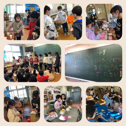 今日は初めてのおもちゃランド!2年1組に、招待した1年1組の皆さんが遊びに来てくれました。どきどきしていた子供たちでしたが、1年生がしっかり説明を聞いてくれたことに自信をもち、一生懸命におもてなしをしていました。終わった後は「ちゃんと声をかけて案内してあげれたよ」「自分たちのお店にたくさんお客さんがきてくれて嬉しかったよ」と大満足の様子。とっても優しいお兄さんお姉さんになれていました。