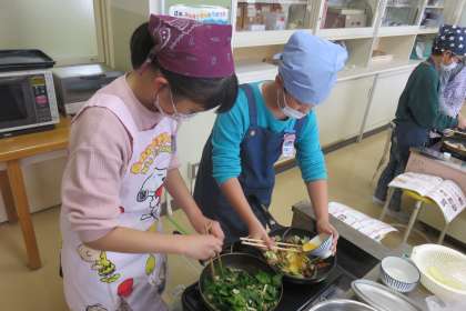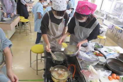 家庭科では一食分の献立を考えるという学習に取り組んでいます。そこで、今日は主菜づくりにチャレンジしました。調理工程の中に「ゆでる」「炒める」の2つがあり、今までの調理実習より複雑です。友達と声をかけあいながら料理を完成させることができました。