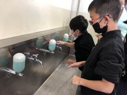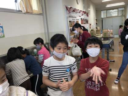 保健委員会の皆さんがやまびこタイムに手洗いの指導にきてくれました。スタンプを手に付けて取れるまで丁寧に洗います。「いつもよりしっかりと洗わないと落ちないよ。」「手洗いするとすっきり気持ちがいいね。」などといつもの手洗いを振り返ったりよさに気付いたりする姿が見られました。