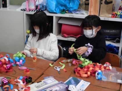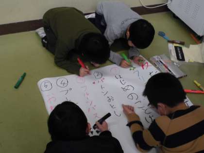 学活では、集会の準備をしています。グループに分かれて出し物を考えたりプログラムを考えたりしています。スムーズにできるように説明の練習をしたり、飾りを作ったりと、楽しい会になるように準備を進めています。