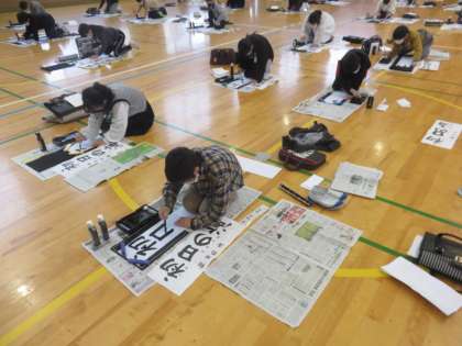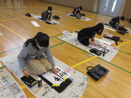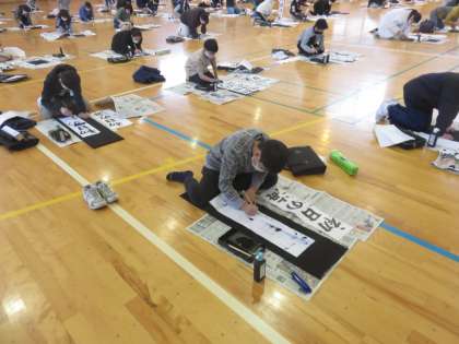 さて、5年生はアリーナで書初大会を行いました。アリーナ全体に広がって、緊張感のある中、集中して取り組みました。
