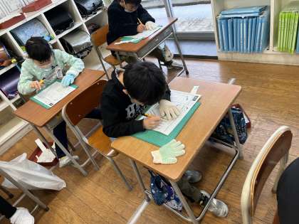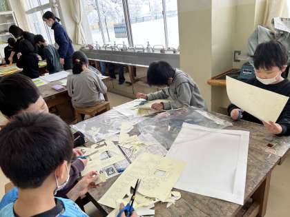 次はシールのパーツを切っていきます。パーツを切るときは、はさみとカッターを使います。カッターは図工で初めて使用するため、直線や曲線を切る練習から始めました。緊張感をもって、真剣に取り組んでいます。