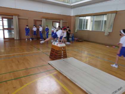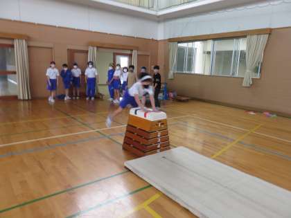 今日は、低い段の跳び箱で手のつく場所や踏切る足を確認しながら行いました。