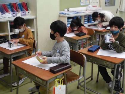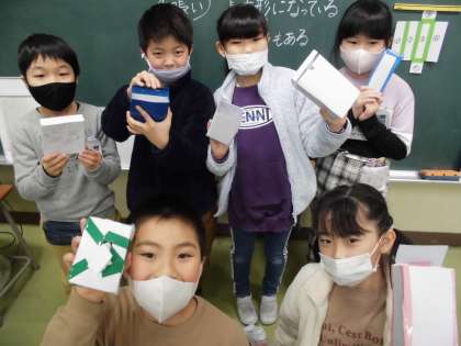 算数では、「はこの形をしらべよう」の学習をしています。身の回りの箱を使って、面の形や数を調べました。「平らなところは、長方形になってるね」「正方形のところもあるよ」と、自分の持っている箱の特徴を友達に伝えていました。面の形を写し取って、自分で箱を組み立てることができました。