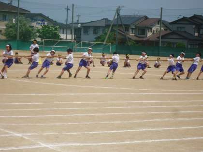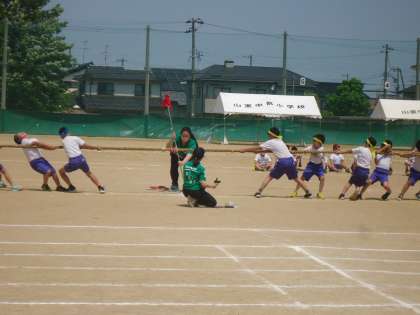 中学年の競技の様子です。3、4年生ともに、「80m走」「綱引き」でした。中学年の元気いっぱいな力が、綱を全力で引く姿に表れていました。見ている人も「がんばれ」と応援したくなりました。