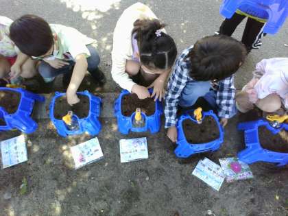 鉢に土を入れ、穴をあけ、種を植えた後に元肥を撒いて、