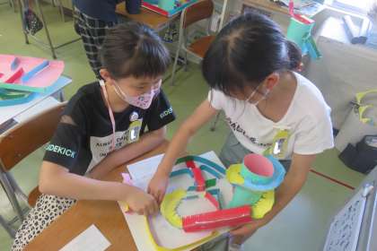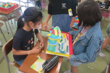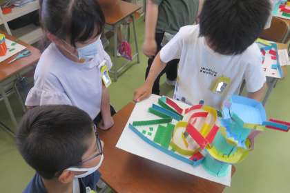 図画工作科の学習で製作していたコロコロガーレが完成し、友達が作った作品を鑑賞しました。様々な工夫が凝らされた作品を楽しみながら鑑賞することができました。