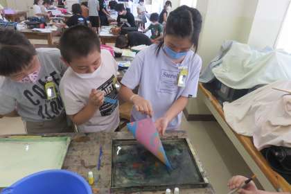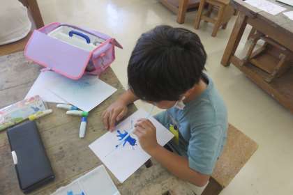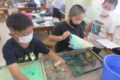 4年生の図画工作科では、絵の具の様々な技法を使ってオリジナルの色画用紙を作っています。スパッタリング、吹き流し、ビー玉に絵の具を付けて転がす、マーブリング等、それぞれの良さを味わいながら、楽しんで作成することができました。