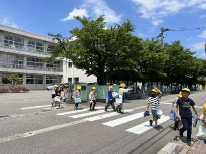 今日は待ちに待った町探検です。晴天の下、元気な声で「いってきます」と言い、学校を出発しました。子供たちは目的地を目指し交通事故に気をつけて一生懸命に歩きました!
