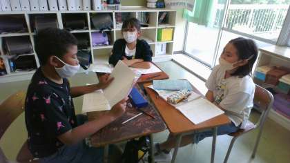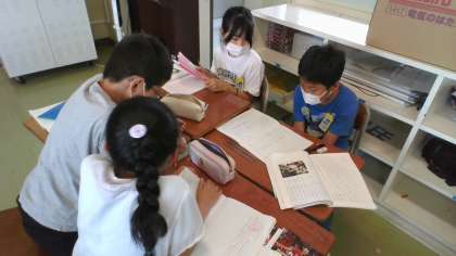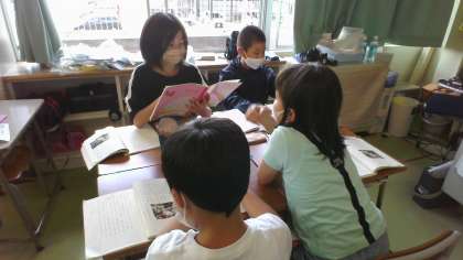 国語科のでは「アップとルーズで伝える」という説明文を学習しています。筆者の考えについて自分の考えをまとめ、友達に伝えています。お家の人のビデオの撮り方やニュース放送で見たことなど、経験を入れて自分の考えを説明していました。