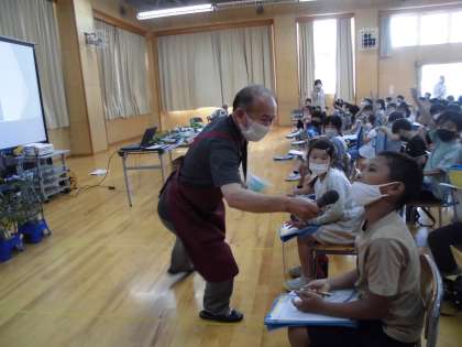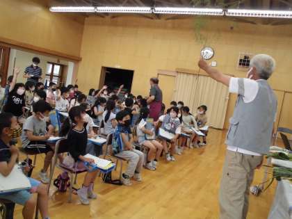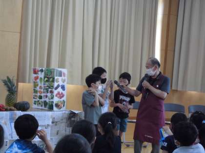 今日は、「旬の野菜や果物」に関する実感、体験学習会がありました。野菜の栄養や魅力について教えていただいた後、育てている野菜で困っていることについて教えていただきました。「あなたの体は、あなたが食べているものでできている。」という言葉が子供たちの心に残りました。