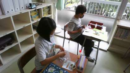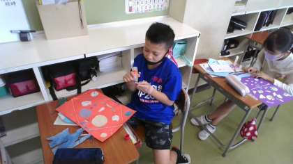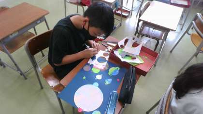 4年生では図画工作科で様々な技法で作った色紙をもとに、切り絵で作品を作っています。色々な色紙から想像を膨らませて楽しい作品をたくさん作る子どもたちです。