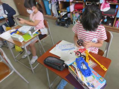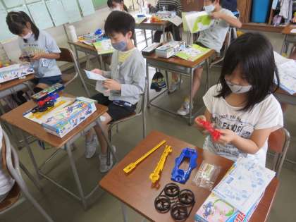 理科「風とゴムのはたらき」で、実験に使う車の教材をつくりました。みんな楽しそうにつくっていました。