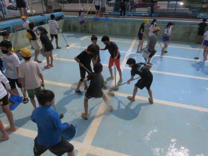 今年のプール開設に向けて、プールの清掃をしました。床をデッキブラシで磨いたり、溝をたわしでこすったりと分担して取り組みました。