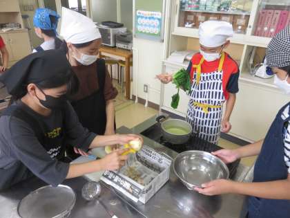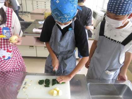 2回目の調理実習として、「青菜のおひたし」と「ゆでいも」を作りました。ほうれん草をゆでている間にじゃがいもの皮むきを始めたり、使い終わった調理器具から洗って片付けたり、手際よく取り組む姿に感心しました。