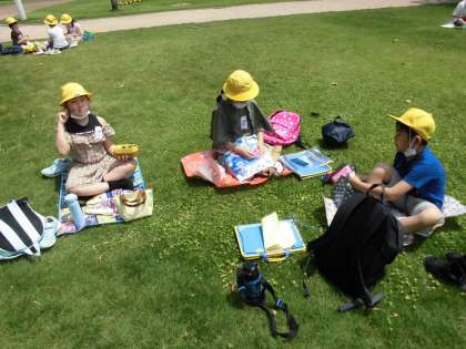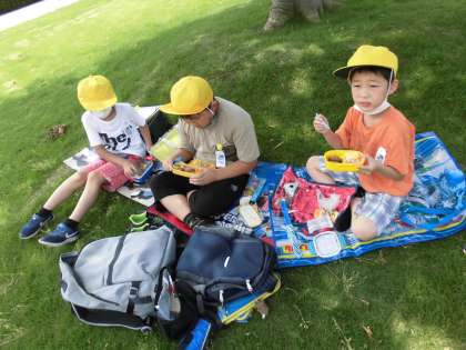 青空の下で、友達と食べることができてとてもうれしそうでした。