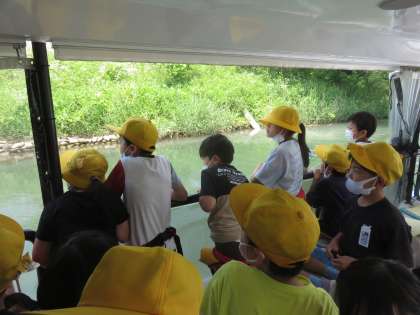 中島閘門や途中見えた亀などの動植物に子供たちは興味津々でした。