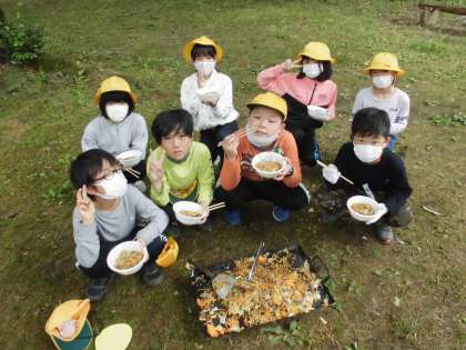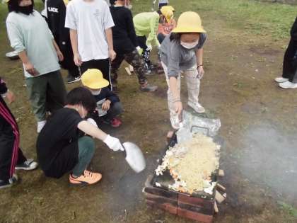 4年生の宿泊学習、2日目は子供たちが楽しみにしていた焼きそばづくりです。野菜を切ったり火をおこしたり、悪戦苦闘しながらも友達と協力して焼きそばを作ることができました。みんな美味しそうに焼きそばを食べていました。自分たちで作った焼きそばは格別だったようです。