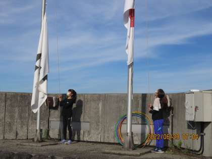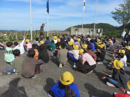 立山広場で朝の集いを行いました。みんなでラジオ体操をしたり、1日めに登った来拝山に向かって「やっほー!」といったりしました。気温は高かったけれど、爽やかな朝になりました。