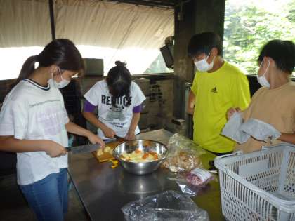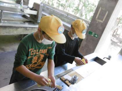 2日目の活動は野外炊飯です。缶カマドで火を起こし、その火を保ちながら調理をしました。油断するとすぐに小さくなってしまう火を管理しながらも、班で協力して米を研いだり野菜を切ったりと取り組みました。