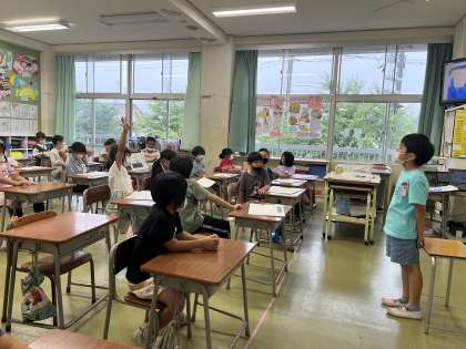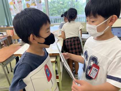 国語では、「あったらいいな」と思うものを考え伝え合う学習をしています。「もっといろいろな色があるといいよ」「こんな働きを追加してみたらどうかな」などと生き生きとアドバイスし合っています。友達に質問をしてもらうと、より詳しく考えることができることが分かりました。