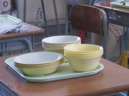 写真は、給食の片付けの様子です。班ごとに同じ食器を重ねたり、ゴミや箸もそろえることで、素早く片付けることができます。食べ終わると声をかけ合い、協力して片付ける子供たち。いい調子です。
