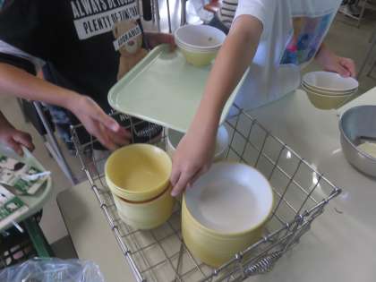 写真は、給食の片付けの様子です。班ごとに同じ食器を重ねたり、ゴミや箸もそろえることで、素早く片付けることができます。食べ終わると声をかけ合い、協力して片付ける子供たち。いい調子です。
