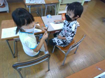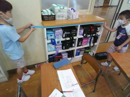 「どちらが長いかな?」と友達と文具の長さを比べたり、紙テープを使って、教室内の物の長さを測ったりしました。