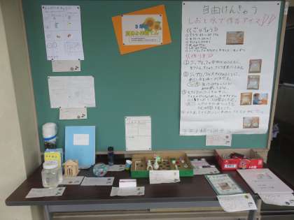 3年生教室前には子供たちが一生懸命取り組んだ自由研究が並べられました。実験をたくさん行い疑問を解明していく作品もあれば、取り組んだことのない手法で綿密に工作されたものもあり、子供たちの様々な頑張りが作品から見て取れます。