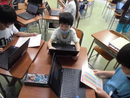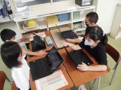三年生はタイピングがとても上手になり、授業でもクロームブックを活用しています。今日は国語科「山小屋で三日間すごすなら」の学習で、ジャムボードを活用しました。山小屋で三日間すごすために持って行きたいものを5つ決める学習では、自分たちが書いた付箋を動かし、グループで話し合う姿が見られました。学習にもとても意欲的に取り組む子供たちです。