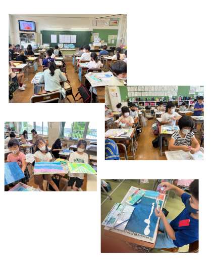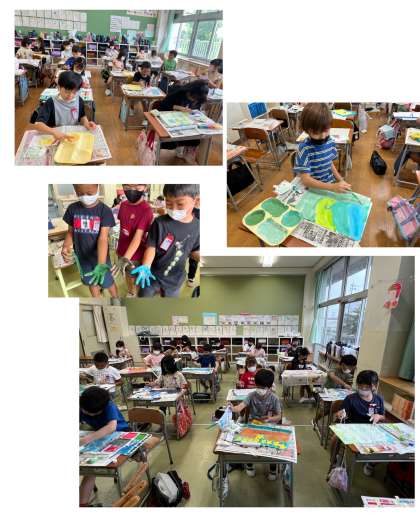図工では、液体粘土を使った作品を作っています。「指で触った感触が気持ちいいな。」「先生、こんな面白い模様ができたよ。」などと、嬉しそうに液体粘土を変化させています。子供たちが作り出す色や形のセンスが素敵で驚きました。これからどんどん工夫を加えていけそうです。