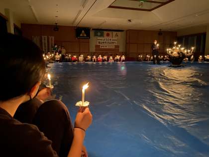 キャンドルサービスの様子です。1部では火を迎え、全員のろうそくに火を灯しました。2部では活動リーダーの企画で友達同士関わり合い、さらに仲間意識を深め、3部では1日を振り返り、明日からもがんばろうという気持ちを高めました。