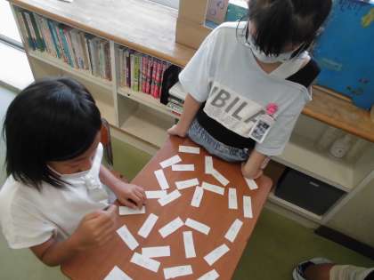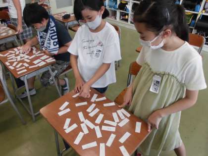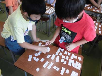 国語科「へんとつくり」の学習では、「へん」と「つくり」からできている漢字がたくさんあることを知りました。学習したことをもとに、各自で漢字パズルを作り、友達の作ったパズルにも挑戦しました。「難しかったけど楽しかったよ。」「自分の書いていない漢字もあったよ。」など、子供たちは意欲的に取り組んでいました。