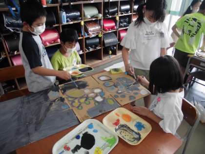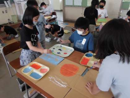 図工では、グループで一つの段ボールに、絵の具で模様をつけました。