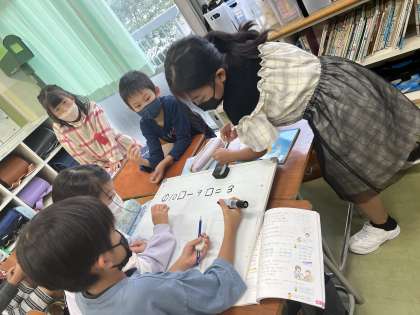 音楽で「虫の声」を歌っている様子、友達と一緒に算数の問題を解いている様子です。