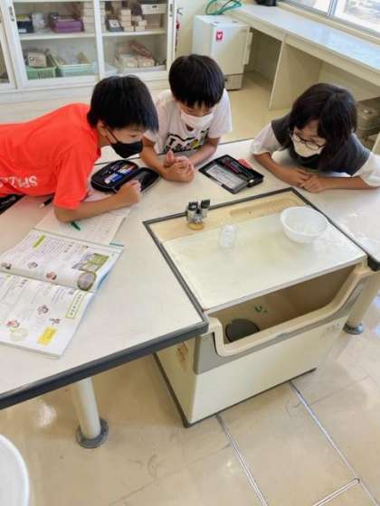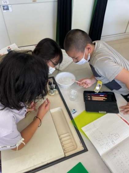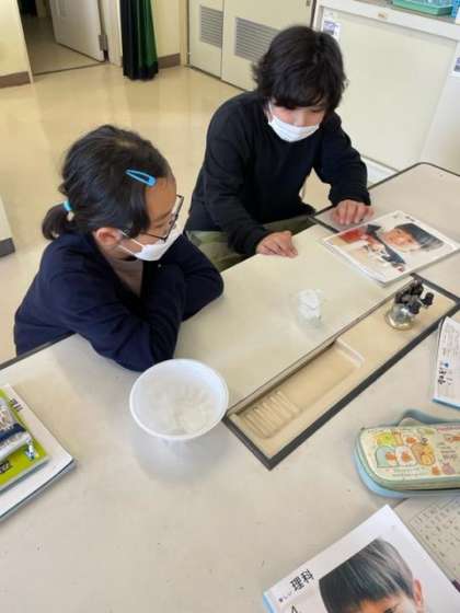 理科では、空気中に消えた水がふたたび見えるすがたに戻るのかを実験で調べました。冷たいコップや牛乳がぬれていることから、冷やせばいいのではないのかと考えた子供たち。ビーカーの中に氷を入れ、空気を冷やして水滴がつくか実験しました。氷の入ったビーカーをじっと見つめ、水滴が見えると「すごい!」と驚きの声があがりました。普段の生活でよく見ている現象がなぜ起こるのかが結びついたことでさらに、色々な自然現象に興味をもってほしいと考えています。