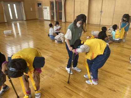総合的な学習の時間「あなたと共に生きる」の活動として、高齢者疑似体験を行いました。富山市ボランティアセンターより疑似体験セットをお借りし、一人一人が高齢者の歩きにくさ、見えにくさ、聞こえにくさを体験することができました。