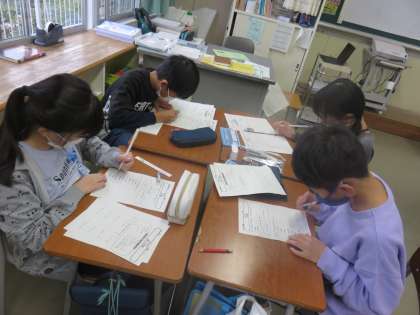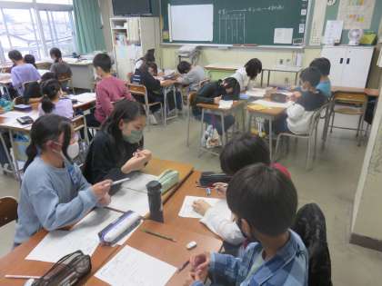 算数科「偶数と奇数・倍数と約数」の学習を終え、グループごとに自分たちの理解を確かめ合いました。基本のプリントを各自解いて、答え合わせをします。答えが違うときこそ、学びの場。互いの考えを伝えたり、答えの根拠を説明したりすることで、「そっか」と納得が得られます。「全員が分かる・できる」ことを目指しながら、仲間との絆も深めていきたいものです。