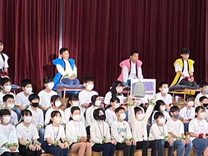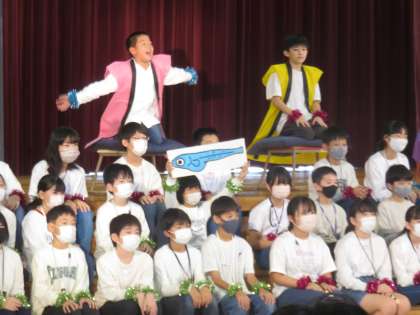 今日は、学習発表会本番当日!最初、笑点のテーマから始まり各メンバーが5年生の学習に関連した大喜利を披露しました。