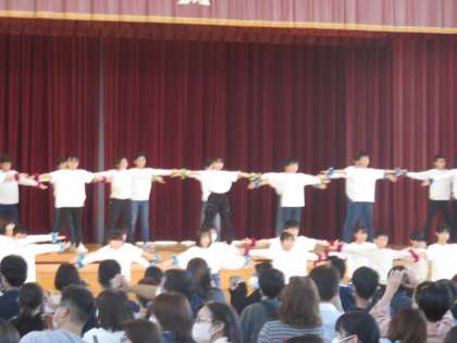 「名探偵コナンのテーマ」の全体合奏!少し緊張していましたが、練習の成果を発揮することができました。アリーナ全体に音色が響き渡り、とても迫力のある演奏でした。発表ラストのダンスは、指先まで意識し体全体を使って力一杯踊りきりました。