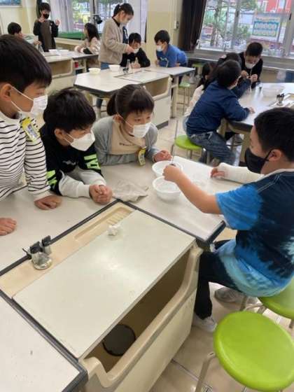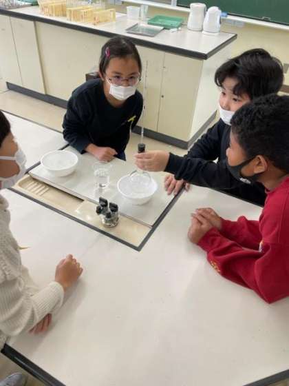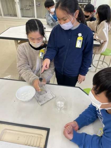 理科では空気の体積と温度の関係について考える学習に取り組んでいます。空気を温めたり冷やしたりして、体積がどのように変わるのか実験しました。実験結果に驚きの声があがっていました。