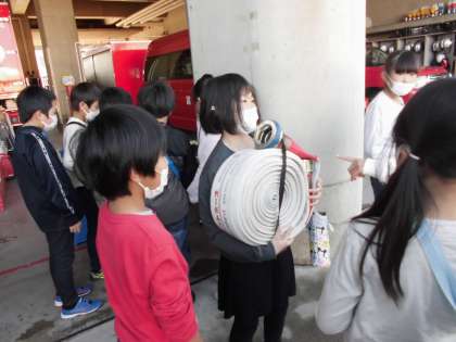 消防署では、実際に使っている道具を見せてもらったり、触らせてもらったりして貴重な機会となりました。初めて見るものばかりで、子供たちは興味深く話を聞いていました。