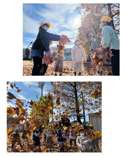 グラウンドに秋見つけに行きました。落ち葉のじゅうたんに大興奮。落ち葉が舞う様子にうっとりしたり、落ち葉を集めて音や触った感じを楽しんだりしていました。