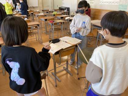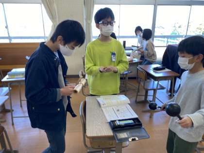 音楽では、打楽器を使ってアンサンブルを練習中です。グループで楽器やリズムを選び、音楽づくりをしています。来週の発表会が楽しみです。