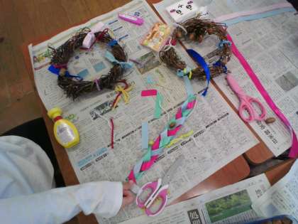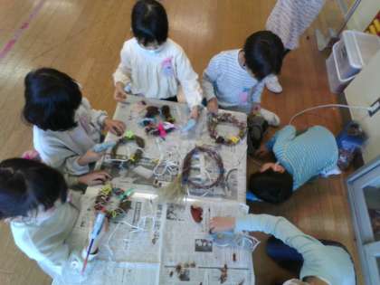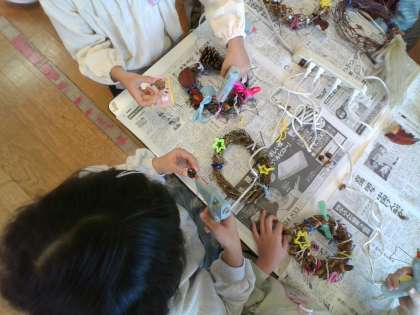 毛糸やリボン、どんぐり等を使って、思い思いにリースを作っていました。