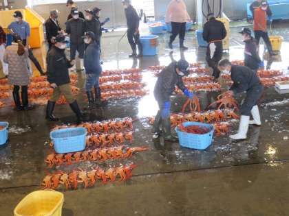 ズワイガニの昼セリの様子を見学しました。鮮度を保ち、新鮮なまま届けるための工夫がたくさんあることを知りました。セリ人と買い手のやりとりを間近で見ることができ、学習してきたこと再確認したり、新しい発見があったりしました。意欲的に質問する姿が見られ、子供たちは満足そうな様子でした。