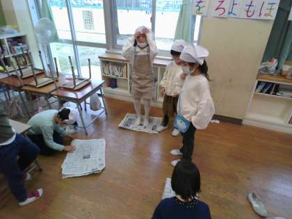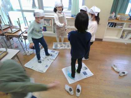 もらった新聞を使い、自分たちでも新聞じゃんけんをして遊んでいました。