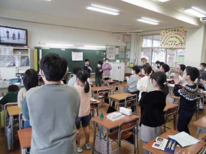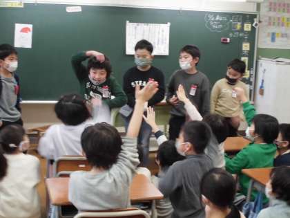 2学期最後の集会を開きました。みんなで「あわてんぼうのサンタクロース」の曲に合わせてダンスをしたり、クイズやゲーム、プレゼントと盛りだくさんでした。集会の題は、「期末テストをがんばった後は、クリスマスを楽しみたい!」というみんなの思いで決定しました。題の通り、思いっきり楽しみました。