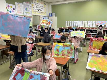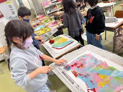 2年生は、版画の学習を始めています。まずはころころローラーを転がして色を重ねていきます。みんな違ってみんな素敵な色合いです。この後パーツを切ってはっていきます。完成が楽しみです。