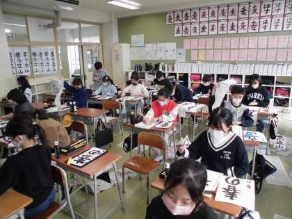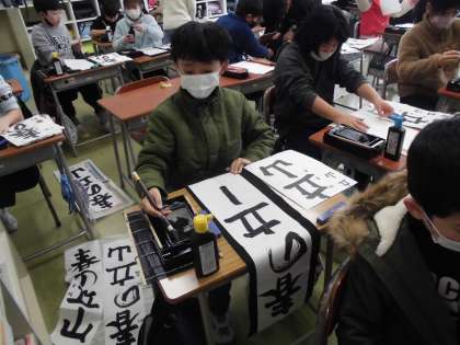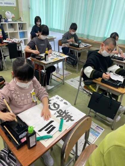 今日は書き初め大会が行われました。冬休み中に何度も練習した成果を発揮しようと、どの子も真剣に取り組んでいました。新年を迎えた晴れ晴れとした思いが込められた作品を書きあげることができたようです。